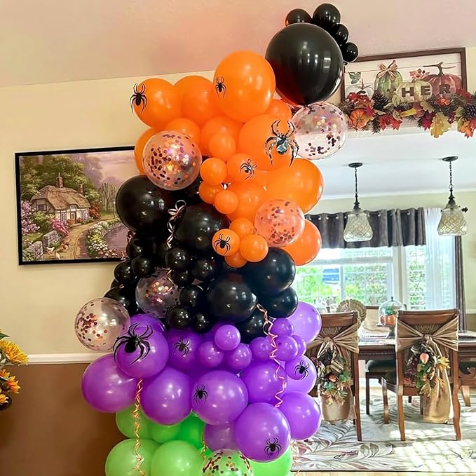 - Package Include: Our orange and black balloons kit includes 10 pcs green balloons, 10 pcs orange balloons, 10 pcs black balloons, 10 pcs purple balloons, 10 pcs purple, black mix orange confetti balloons, 1 orange ribbon and 1 black ribbon