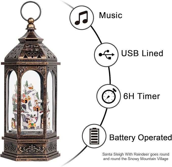 - 🏔️【Christmas Decorations Indoor】Inside our 12.8 inch snow globe lantern a snowy mountain village with Santa Sleigh With Reindeer going round and round in swirling glitter.