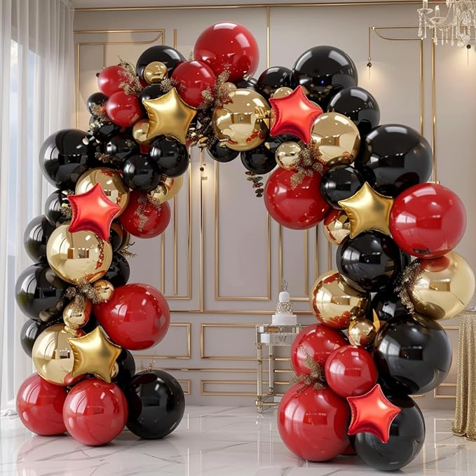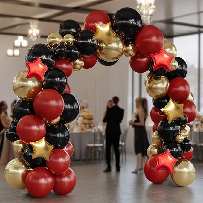 - Easy to Assemble: Inflatered red gold and black balloons to different sizes and tie the balloon knots together with decorative strip, stick the balloon garland on a party background with ribbon, use dot glue to stick 5 inch balloons onto the balloon arch to fill in the gaps.
