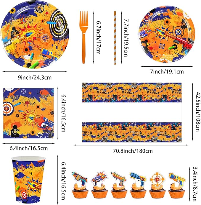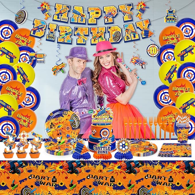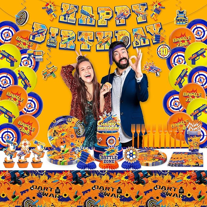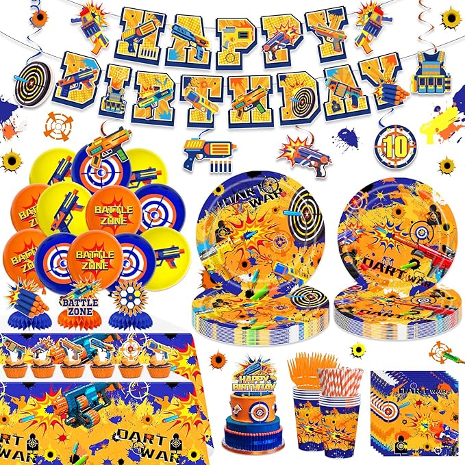 188PCS Dart War Party Supplies Birthday Decorations Dart Battle Disposable Plates Napkins Set, Banner, Hanging Swirls, Tablecloth, Cake Topper, Balloon, Honeycomb Centerpieces Table Decorations