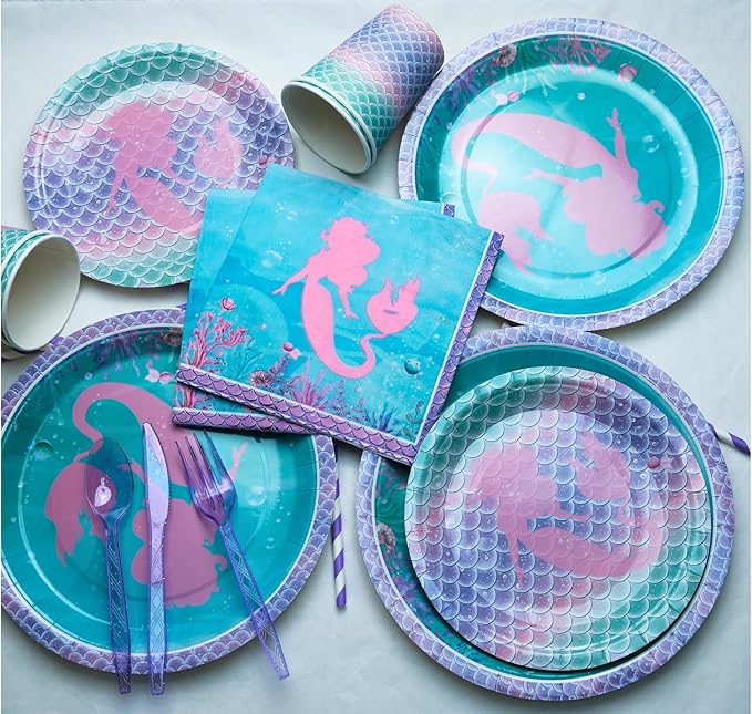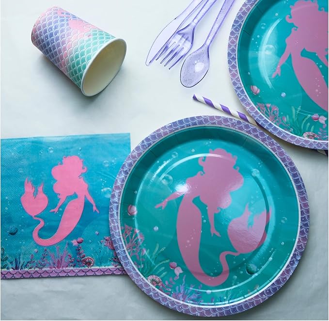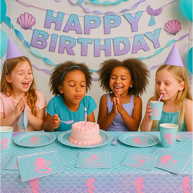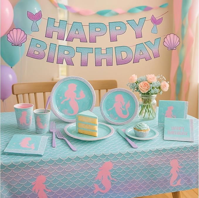 - π Complete Mermaid Party Kit for 16 Guests β All-in-one set includes a vibrant Happy Birthday banner (with hanging string + adhesive dots for easy setup), 9" & 7" mermaid plates, 6.5" napkins, cups, purple cutlery, waterproof tablecloth (54"x108"), and a special greeting card β everything you need in one box, no extra purchases required.