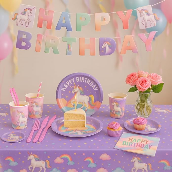 - π¦ Complete Unicorn Party Kit for 24 Guests β All-in-one set includes Happy Birthday banner (with hanging string + adhesive dots), 9" dinner plates, 7" dessert plates, cups, napkins, pink cutlery, tablecloth, straws, and a beautiful greeting card β no extra purchases required.