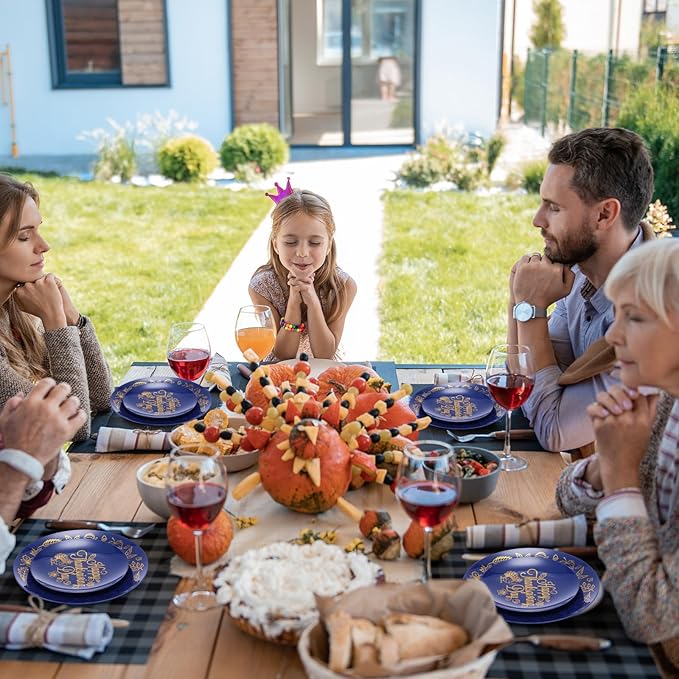 - Thanksgiving Day Style Design: experience the magic of thanksgiving with our navy blue plates, decorated with hot stamping harvest pattern and thanksgiving day text for an added touch of style, the wide range of styles ensures these plates seamlessly blend with your existing decoration, bringing an added touch of elegance to your meal