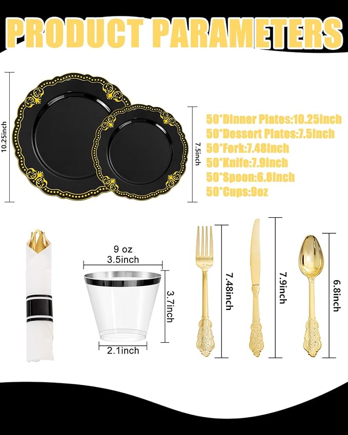 - Suitable for various occasions: These elegant disposable plates exude elegance and grandeur, making them a great fit for diverse events like weddings, parties, birthdays, anniversary, family gatherings, and engagement parties. The black and gold plastic plates add the perfect touch to celebrating those unforgettable moments.