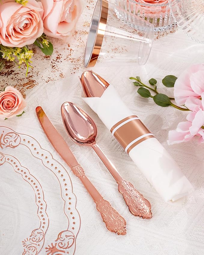- Great Value: While these rose gold dinnerware sets are designed for single-use, this set of Baroque-style rose gold rimmed plates proves to be a far more economical alternative to traditional porcelain or ceramic tableware. Thanks to this elegant disposable plates, hosts can craft a luxurious dining atmosphere without fretting over potential breakage or the hassle of extensive post-event cleaning.