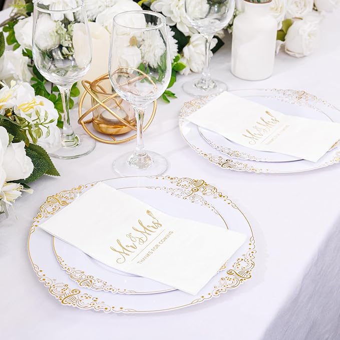 - Elegant Mr. & Mrs. Design: The gold wedding napkins feature a stylish gold "Mr & Mrs" message, perfect for adding a touch of sophistication to any wedding or anniversary celebration. Each mr and mrs napkins also includes a "Thanks for Coming" note, making your guests feel appreciated.