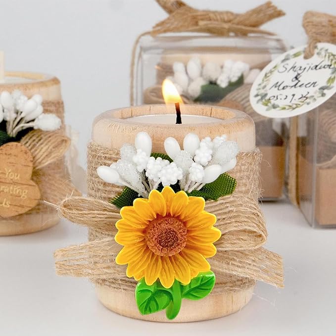 24 Pack Sunflower Wood Tealight Handmade Candle Holders - Wedding, Baby Shower, Baptism Favors & Centerpieces, Cylinder Candles Decorations