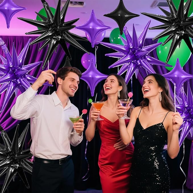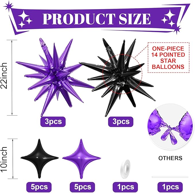 - Black Purple Star Balloons Set:Package include 6pcs 22Inch explosion star balloons(black x 3,purple x 3),10pcs 10Inch four pointd star balloons(black x 5,purple x 5).Large enough to help you better decorate your party.