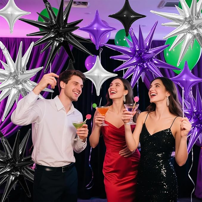 - Black Purple Silver Star Balloons Set:Package include 6pcs 22Inch explosion star balloons(black x 2,purple x 2,silver x 2),10pcs 10Inch four pointd star balloons(black x 4,purple x 3,silver x 3). Large enough to help you better decorate your party.
