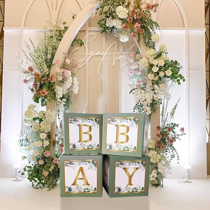 - DECORATIVE SET: Four elegant sage green boxes featuring gold metallic letters spelling 'BABY', perfect for baby shower decorations and party displays