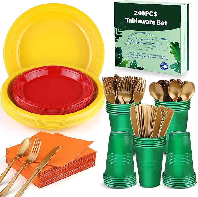 - Hassle-Free Cleanup and Effortless Use: enjoy your event without worrying about post-party washing up; these disposable plastic plates, cups, napkins, and cutlery are designed for single use, saving you valuable time and effort on cleaning; after your celebration ends, simply gather and dispose of them, allowing you to focus on making memories with your guests