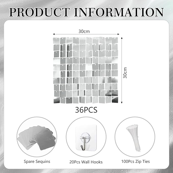 36 PCS Silver Shimmer Wall Backdrop, Square Sequin Photo Backdrops Panel, Glitter Wall Background for Birthdays, Weddings, Halloween, Engagements, Disco Bachelorette Party Decoration (6FTx6FT)