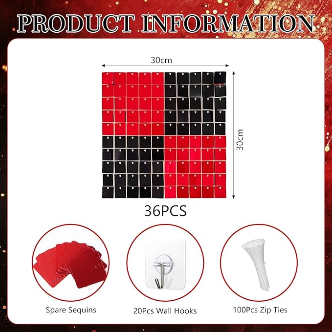 - 【Package Includes】Each box includes 36 black red sequin wall panels (12"x 12" each). We provide enough zip ties (100 pcs), a pack of spare sequins, and wall hooks (20 pcs) to support the weight of the wind panel, as well as an installation manual. 36pcs can cover 6x6ft place. More boxs will cover a larger area and have a fuller look.