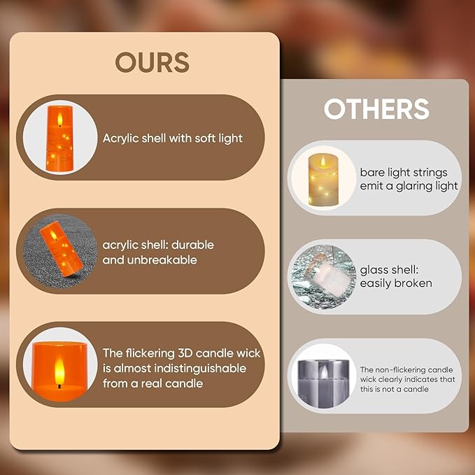 - 【Safe & Flameless】: These flickering Flameless candles offer the beauty of traditional candles without the risk of an open flame. Enjoy peace of mind as they provide a safe option, especially in homes with children or pets where you don't have to worry about fire.