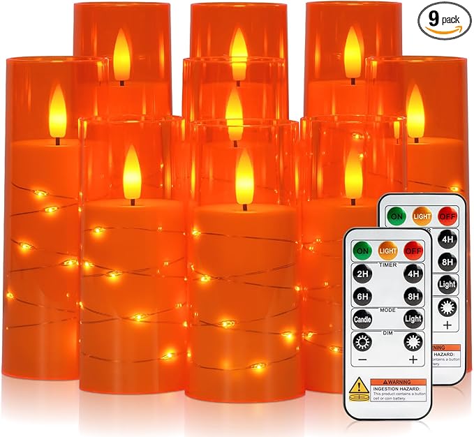 Raycare Flameless Candle with Remote Timer – 9 Flickering Acrylic Battery Operated LED Pillar Candles with Embedded Star String for Halloween, Home Decor, and as a Gift (Orange)