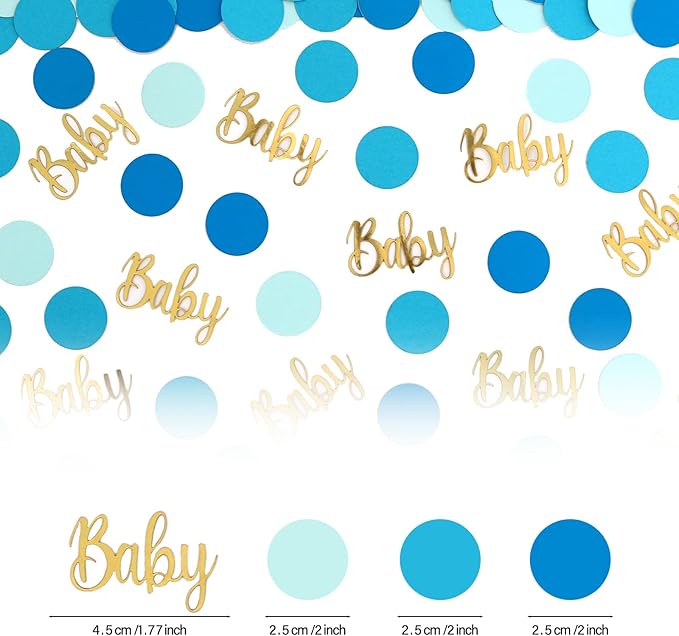 - Elegant design:Gender reveal confetti are designed in the shape of cute circle and golden glitter letters "baby", The circle is in three different shades of blue:fluorescent blue,lake blue and light blue,It is more suitable for baby shower decorations boy,gender reveal party table decor,baby sprinkle decorations for boy.