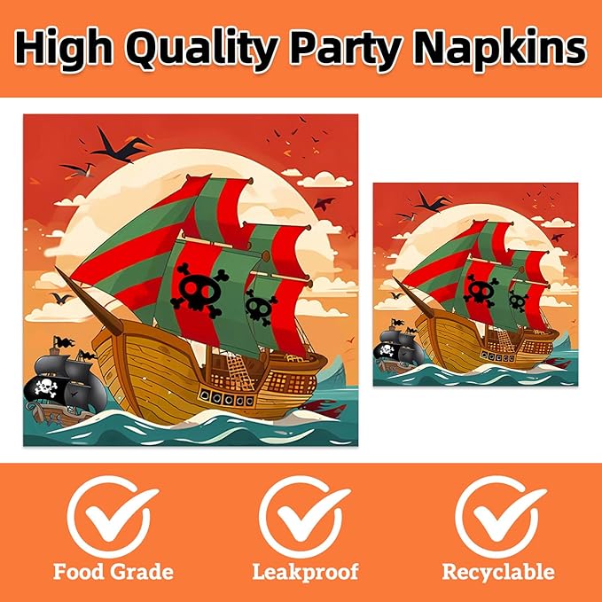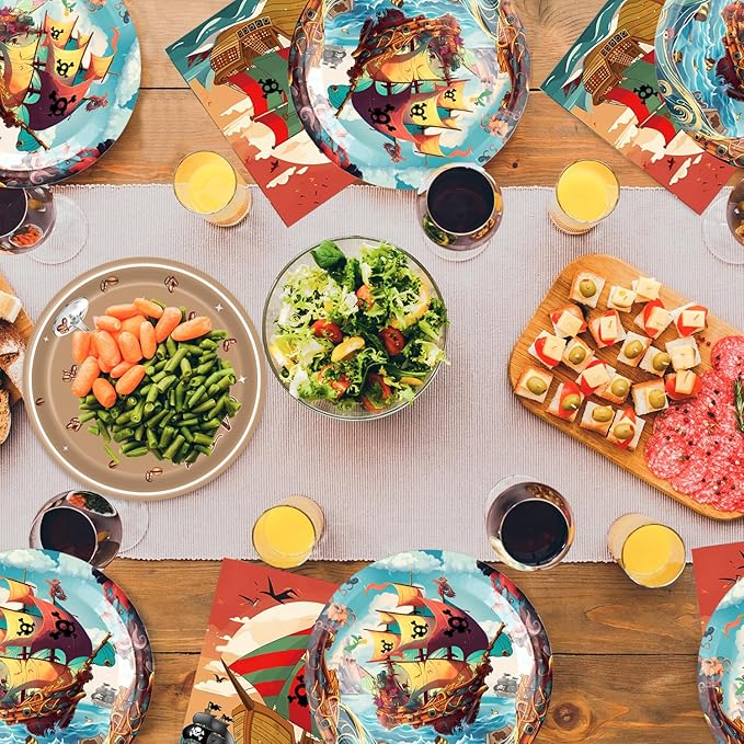 - Bold Pirate Adventure Design: Treasure chests, pirate ships, skull and crossbones. Plates and napkins match seamlessly, turning your table into a "mini pirate ship" hub.
