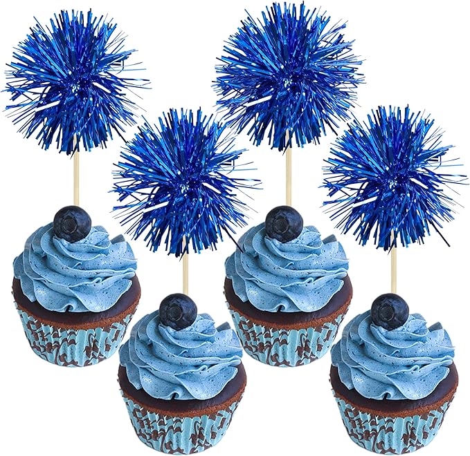 Gyufise 30Pcs Foil Firework Cupcake Toppers Sparkle Tinsel Cake Toppers Tinsel Drink Cake Decoration Cocktail Picks for Birthday Wedding Graduation Party Supplies Dark Blue