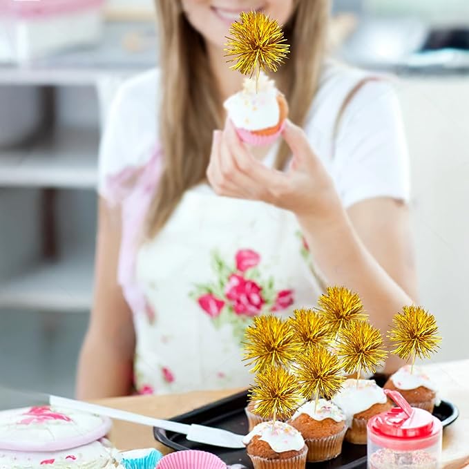 Gyufise 30Pcs Foil Firework Cupcake Toppers Sparkle Tinsel Cake Toppers Tinsel Drink Cake Decoration Cocktail Picks for Birthday Wedding Graduation Party Supplies Dark Gold