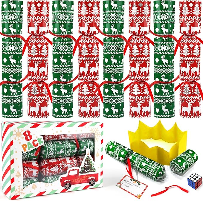 8 Pack Christmas Party Favor No-Snap, Red & Green Xmas Design Includes Party Hat, Joke & Gifts, Christmas Table Decorations for Kids, Holiday Dinner Traditions Party Supplies, Stocking Stuffers