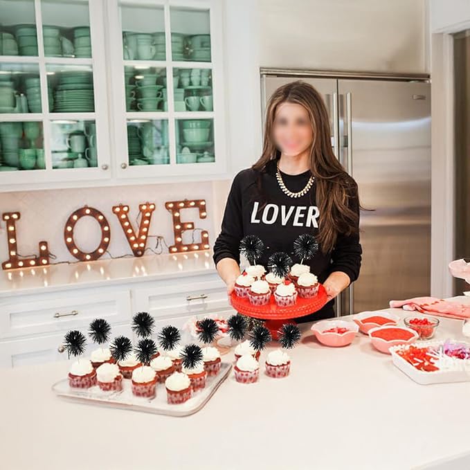 Ephlyn 30Pcs Foil Firework Cupcake Toppers Sparkle Tinsel Cupcake Picks Happy Birthday Cake Decorations Drink Stirrers Cocktail Food Fruit Toothpicks for Baby Shower Graduation Party Supplies Black