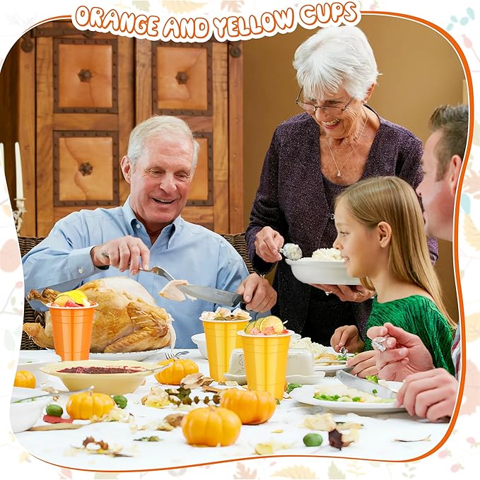 - Time-Saving & Space-Saving: These Thanksgiving colored plastic cups feature a stackable design, allowing efficient storage space utilization. These yellow and orange disposable cups eliminate the need for washing and can be easily discarded after use, saving you a significant amount of cleaning time and allowing you to fully enjoy your Thanksgiving and fall parties with convenience and happiness.