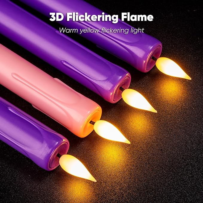 - Package: Each package contains 3 purple and 1 pink dripless taper candles, and a 10-keys remote. Each battery power taper candle is thoroughly and rigorously tested before sale, Avoid using in high-temperature environment.