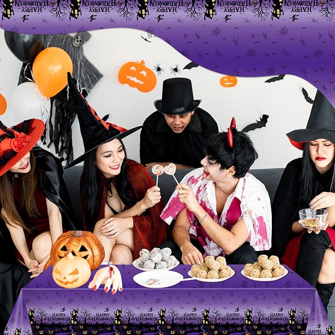 - 2 CONTRASTING COLOR SCHEMES: Includes both purple-black and orange-black halloween table cloths (one of each design), allowing you to create coordinated yet distinct looks throughout your party space or decorate multiple tables with complementary scary themes.