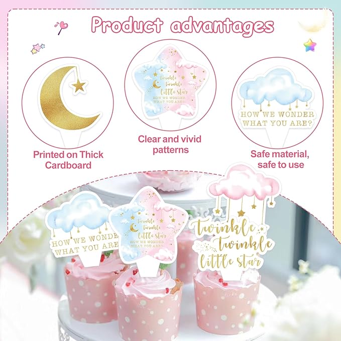 20 PCS Baby Shower Cupcake Toppers, Twinkle Twinkle Little Star Gender Reveal Decorations, Cake Party Supplies Decorations Gender Reveal Party Decorations for Baby Shower Boy Girl Birthday