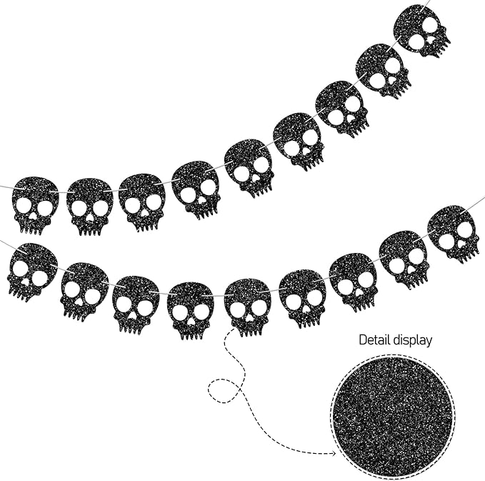 2PC Black Skull Garland for Halloween Party Decorations Glitter Skull Banner for Gothic Birthday Decorations Supplies