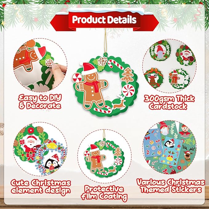 - Kids Christmas Party Favors: This set of Christmas Ornament Crafts for Kids contains 28pcs Christmas wreath ornament cards, 28pcs sheets matching DIY stickers, and 28 silk treads, the wreath cards measure about 5.8"-6.3", including 7 adorable Christmas-themed characters and animals: gingerbread man, Christmas Reindeer, snowman, penguin, and gnome, with 4 of each design, making it nice Christmas goodie bag stuffers for kids. Let's make your own Christmas ornaments