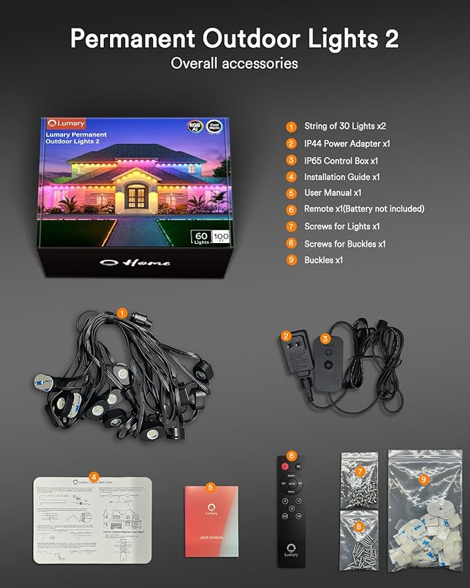 - All-Weather Reliability: Lumary year-round outdoor lights are IP67 waterproof with an IP65 control box. The 30/60 lights of adapter are IP44. They are crafted from anti-UV materials. Up to 50,000 hours and withstand extreme weather from -4°F to 140°F (-20°C-60°C). Note, IP67 Wire Connector, Extension Cabe and Wire Cover are not included, can be bought in Lumary. Purchase on demand to reduce unnecessary expenses! Do not allow to extend the lights with several set of light, unless contact us and buy high power control box and adapter