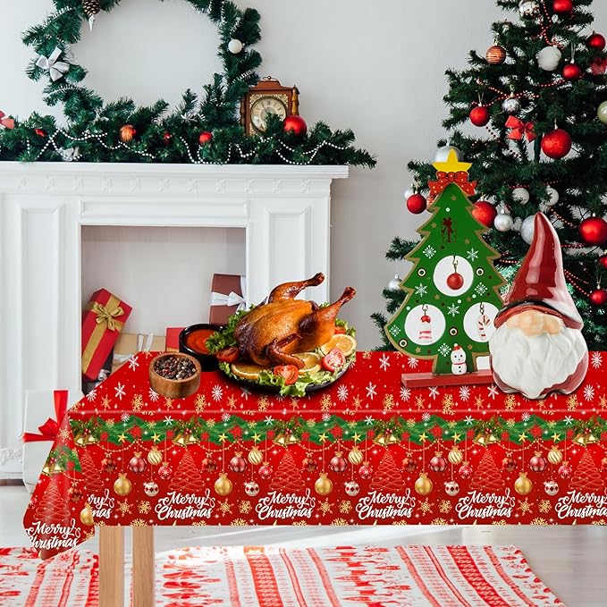 - Festive 2-Pack Christmas Design: This value pack includes two vibrant christmas tablecloths featuring a classic holiday pattern with Christmas bells, "Merry Christmas" greetings, and festive trees in traditional red and green colors. Perfect for decorating multiple tables or having a spare for unexpected gatherings during the holiday season.