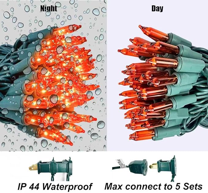 - Specifications:100 count Incandescent Ceramic orange color bulb on black wire, 26.5 Feet total length include 2 replacement fuse ,2 extra spare bulb.Lead wire 18 Inch bulb spacing 3 Inch , end tail 3 Inch. Weather Resistance in any conditions