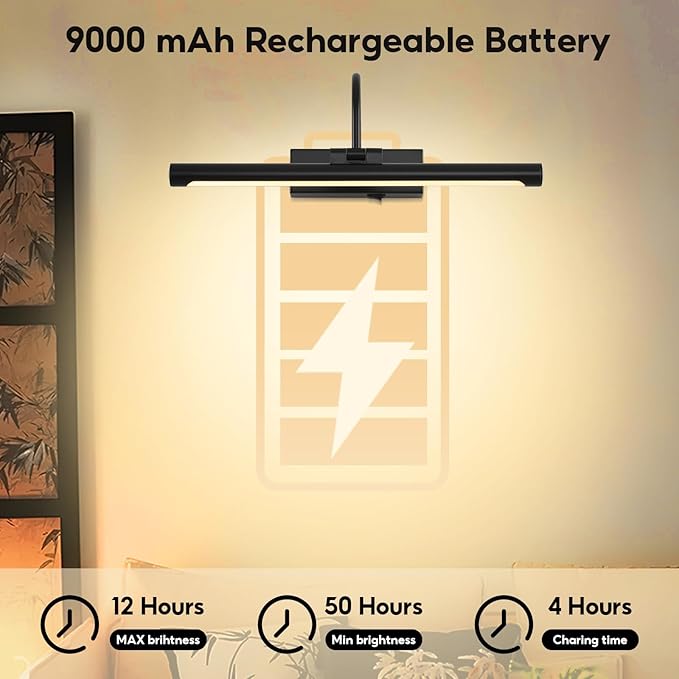 - Battery Operated Picture Light: This 19.69 inch picture light features a built-in 9000mAh rechargeable battery and includes a USB-C charging cable. Eliminating the need for hard wiring, this black wireless art light is entirely battery-powered. A single charge provides extended use, lasting up to 30 hours at its lowest brightness setting.