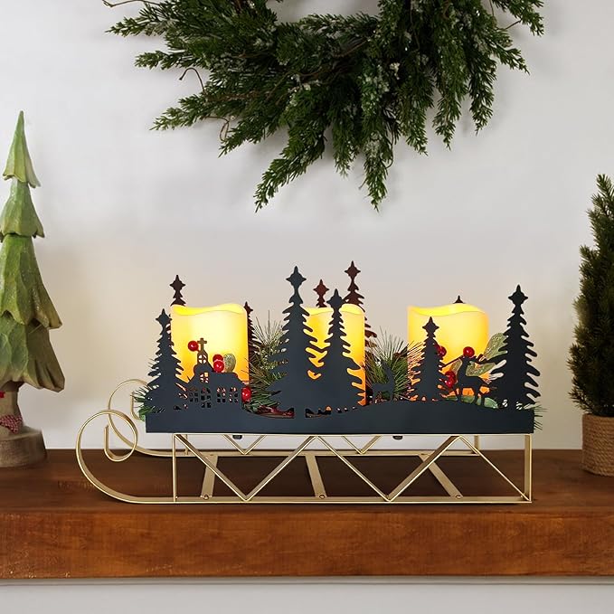 - Unique Design: A metal sleigh features sides that are cut out in the silhouettes of trees, houses, and deer as three LED candles illuminate a beautiful glow, and incorporate traditional Christmas elements such as pine cones, red berries. Exhibit exquisite detail and beauty