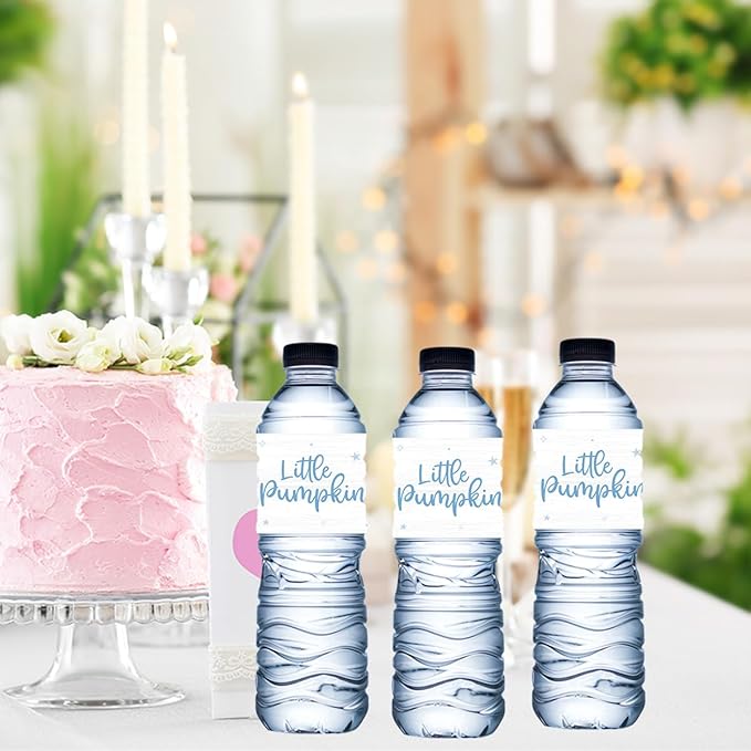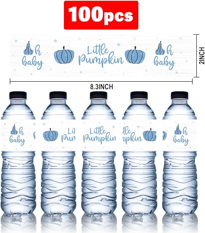 100Pcs Blue Little Pumpkin Boy Baby Shower Water Bottle Labels Waterproof Wrappers for Fall Baby Shower Decorations and Party Drink Stations