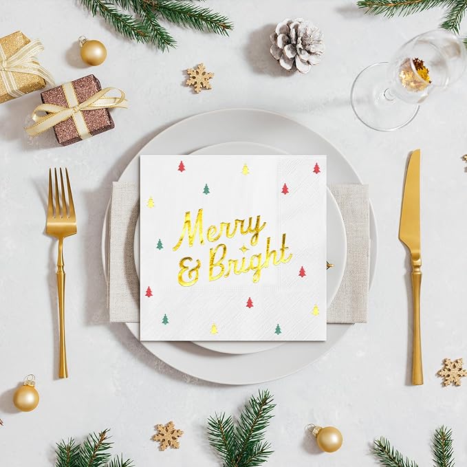 - Elegant Gold Foil Design — Each napkin features Merry & Bright in shining gold foil with colorful foil Christmas trees, adding sparkle to your merry and bright Christmas decor and festive table setup