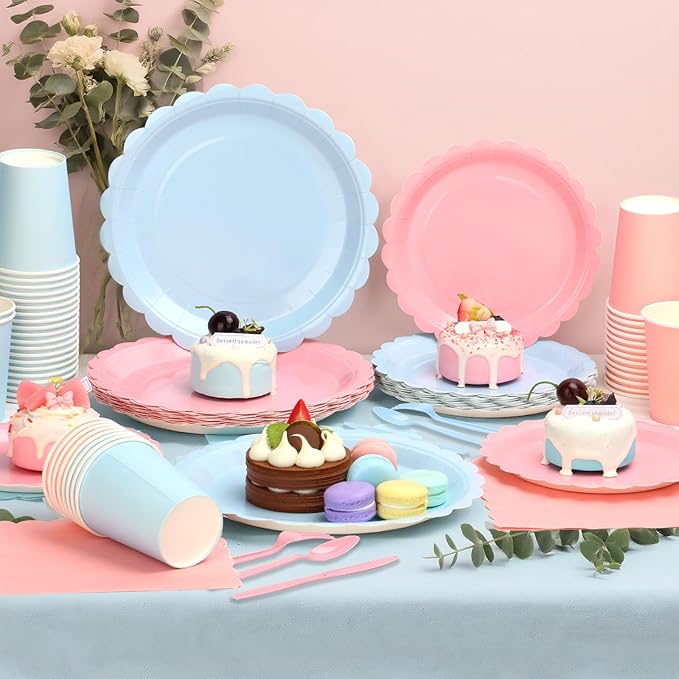 - In The Box: There Are 52 Pieces Of 9 Inch Pink And Blue Disposable Scalloped Plates, 52 Pieces Of 7 Inch Pink And Blue Plates,104 Pieces Of Pink And Blue Cocktail Napkins With Scalloped Edge, 52 Pieces Pink And Blue 9OZ Paper Cups, 52 Sets Of Sturdy Plastic Knife/Fork/Spoon, 416 Pieces In Total Can Well Meeting Your Different Party Needs