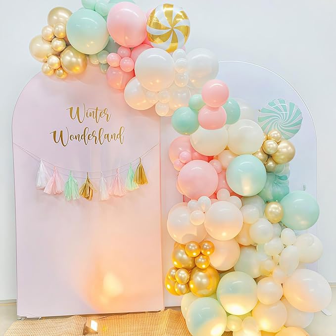 - Chic Pastel Balloon Theme – This balloon set combines sand white, macaron green, macaron pink, and metallic gold to create a stylish pastel palette with a festive twist. The soft colors with gold accents bring elegance and playfulness, perfect for birthdays, weddings, baby showers, bridal showers, or seasonal holiday parties. It also pairs beautifully with Nut-inspired Christmas cracker décor for a whimsical and charming atmosphere.