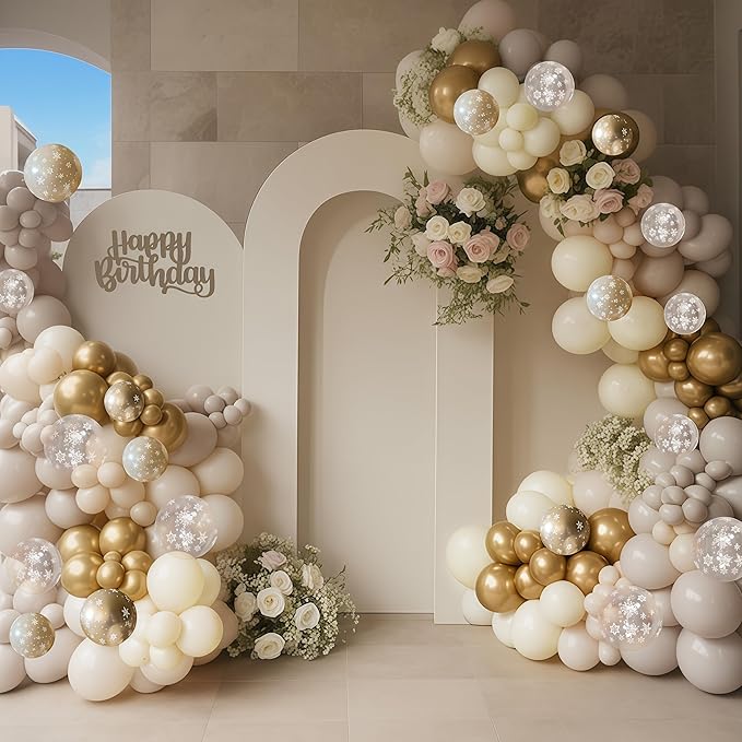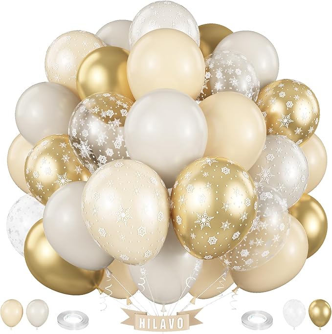 - Package Includes – You will receive 60 pieces of 12-inch balloons: 15pcs ivory white, 15pcs sand white, 20pcs transparent snowflake printed, and 10pcs metallic gold balloons. To help with setup, the kit also includes 2 rolls of 10-meter ribbon, giving you everything you need to create stunning balloon arrangements, arches, or bouquets for your event.