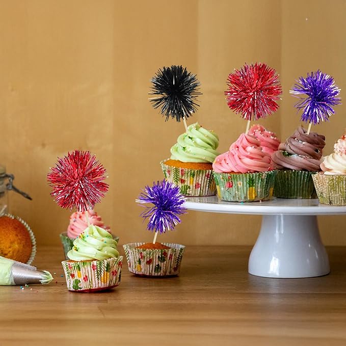 Gyufise 30Pcs Foil Firework Cupcake Toppers Sparkle Tinsel Cake Toppers Tinsel Drink Cake Decoration Cocktail Picks for Halloween Birthday Wedding Graduation Party Supplies Purple Black Red