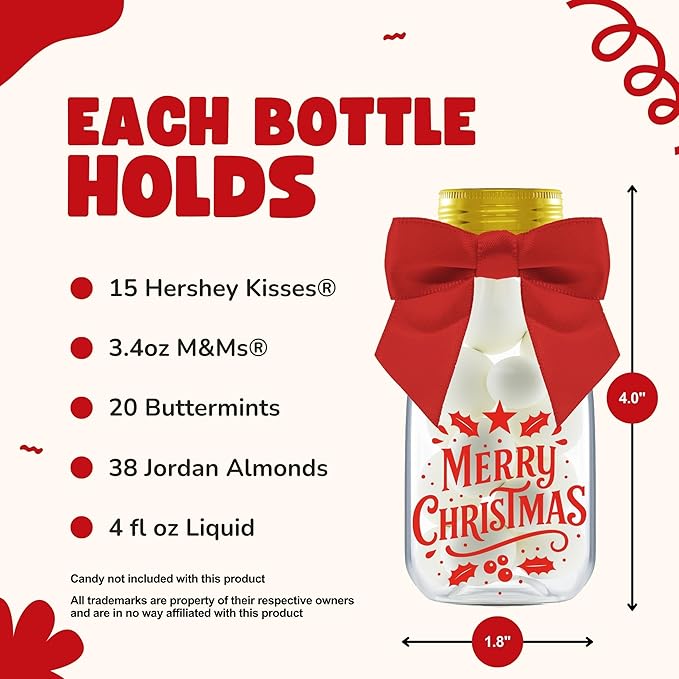 - INCLUDES - 12 Plastic Bottles, Gold Caps, Themed Ribbons, Christmas Stickers, and Thank You Stickers. Each bottle measures 4.00 x 1.80 inches and holds 4 ounces, perfect for creating fun decorations