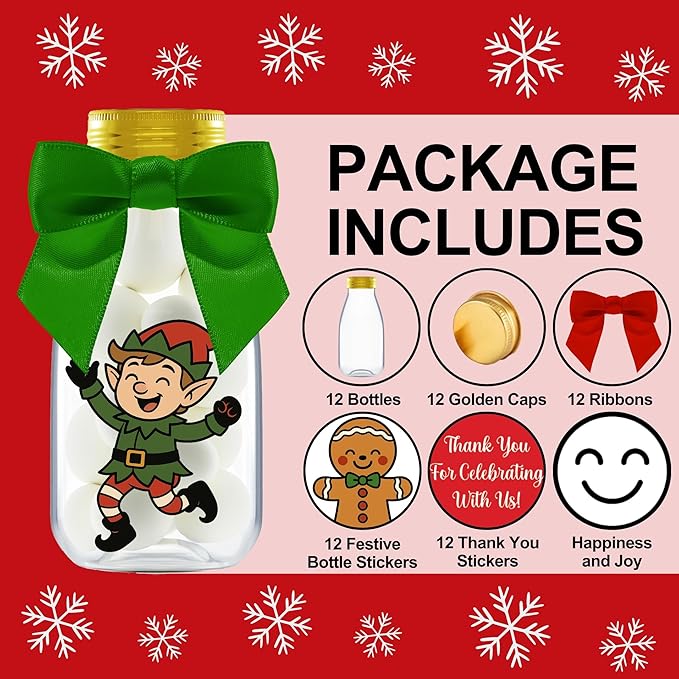 - INCLUDES - 12 Plastic Bottles, Gold Caps, Themed Ribbons, Santa Stickers, and Thank You Stickers. Each bottle measures 4.00 x 1.80 inches and holds 4 ounces, perfect for creating fun decorations