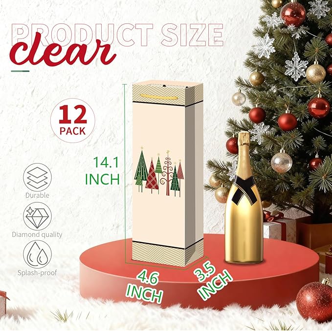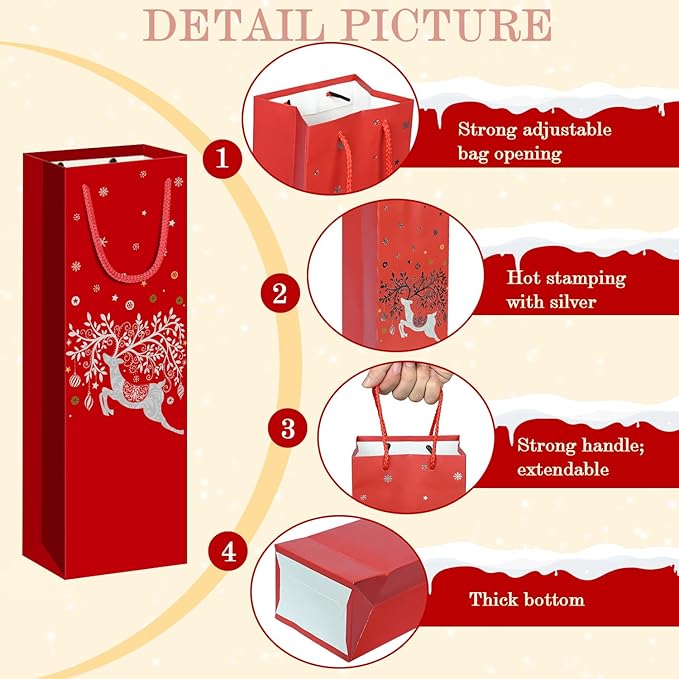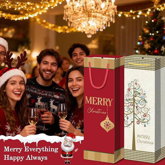 - 【Durable and Sturdy Quality】These wine christmas gift bags are meticulously crafted from high-quality thick cardboard, with each bag featuring a securely attached rope handle designed to withstand multiple uses during the busy party season. They are easy to carry, while adding a touch of safety and elegance. As you share holiday joy, these bags offer comfort and convenience, making every gift-giving moment filled with festive delight.