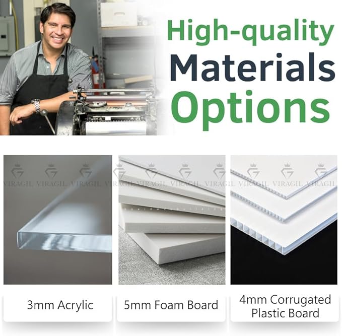 - 🎉 Premium Quality Materials – Choose the perfect fit for your event: 4mm corrugated plastic for durable outdoor use, 5mm foam board for a polished indoor display, or 3mm acrylic for a high-end, elegant finish.