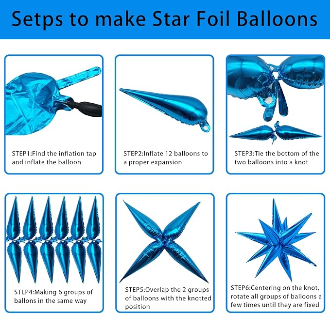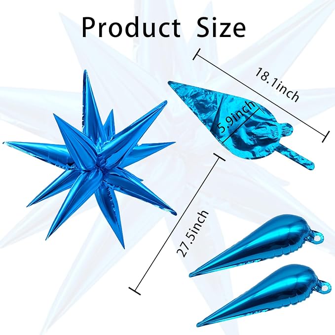 - Eye-catching Mylar Star Balloons: The set includes 60 individual blue cones for you to assemble 5 blue balloons.The unique 12-pointed star shape adds a touch of elegance and creativity to any celebration.