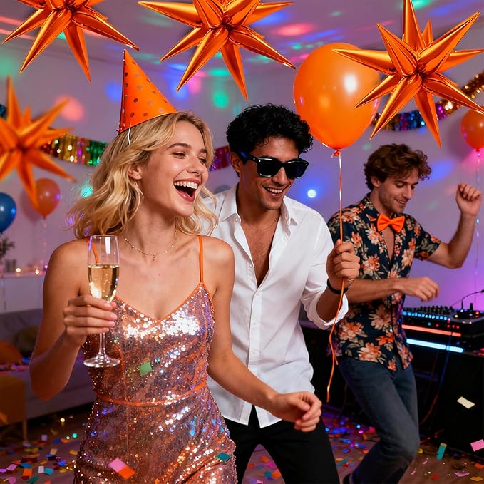 - Orange Party Decorations - Assemble 12pcs individual orange spike balloons to create a dazzling 27.5 Inch large star balloon. Metallic mylar balloons create an eye-catching photo backdrop for Halloween, Christmas, or wedding celebrations.