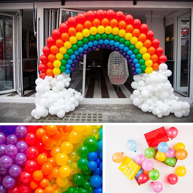 - Vibrant Rainbow Party Decorations:Transform birthdays, baby showers, weddings, or themed parties with these assorted rainbow latex balloons!Mix 10 bold colors to create eye-catching balloon arches, rainbow birthday decorations, or festive backdrops.Perfect for indoor and outdoor celebrations, these colorful balloons add a joyful touch to any event.