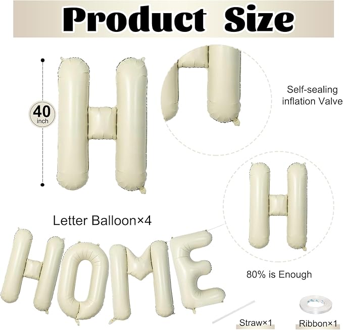 - What You Will Get - Our HOME balloon kit includes 4 pieces 40 inch large "H O M E" foil letter balloons banner, 1pc balloon ribbon and 1 straw.Create your own unique party scene
